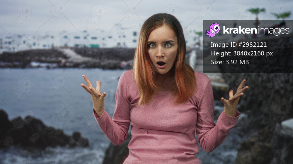 Woman with raised hands and open mouth gesturing near a rocky seawall and white buildings on a street wearing a pink sweater; surprise.