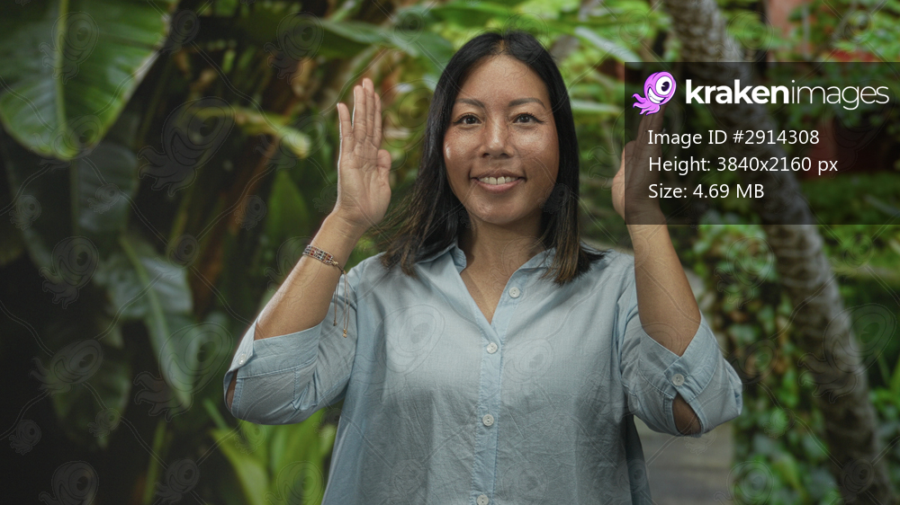 Woman with raised hands and palms facing each other in forest among tropical plants, smiling and gesturing; calm thoughtful reflection.
