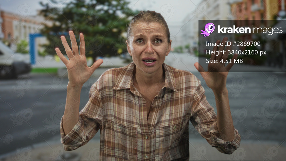 Woman with raised hands and pleading expression wearing plaid shirt on city street near tree and buildings; distress plea.
