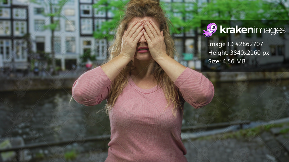 Woman with raised hands and pleading gesture beside a canal on a street with buildings and water reflections; frustration.