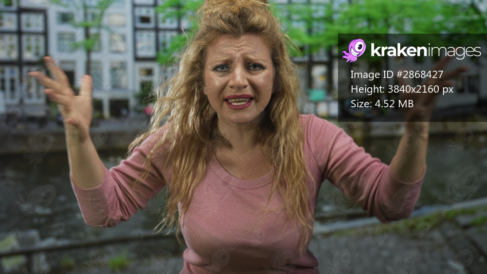 Woman with raised hands and pleading gesture beside a canal on a street with buildings and water reflections; frustration.