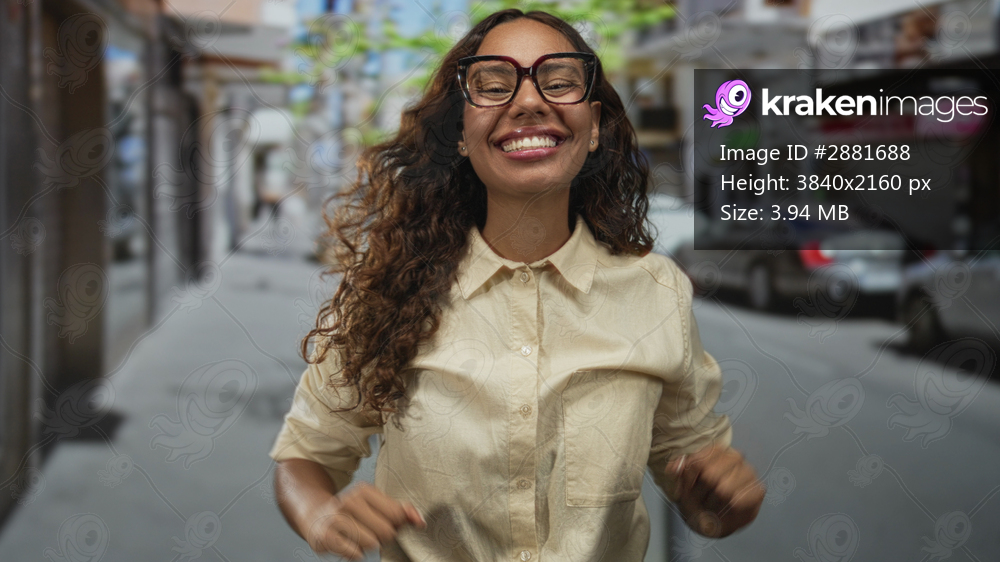 Woman with raised hands smiling on a city street wearing glasses and beige shirt; joy celebration confidence.