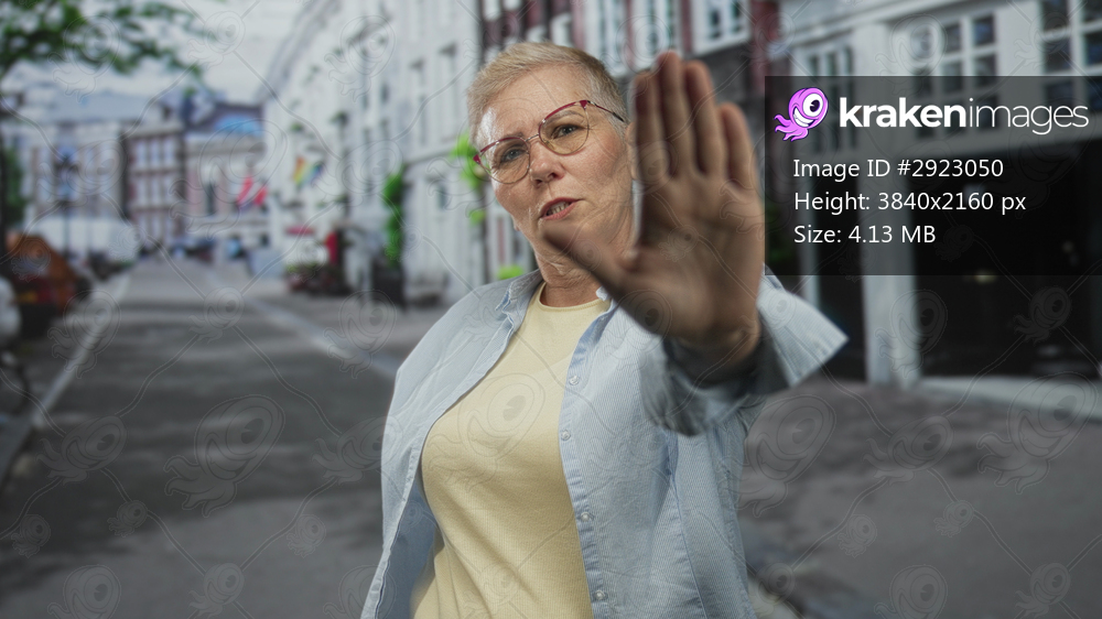 Woman with raised palm to camera on street in city, wearing glasses and casual shirt; defiance boundary.