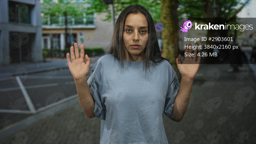 Woman with raised palms and open hands on a city street, facing camera with a serious neutral expression; concern surrender.