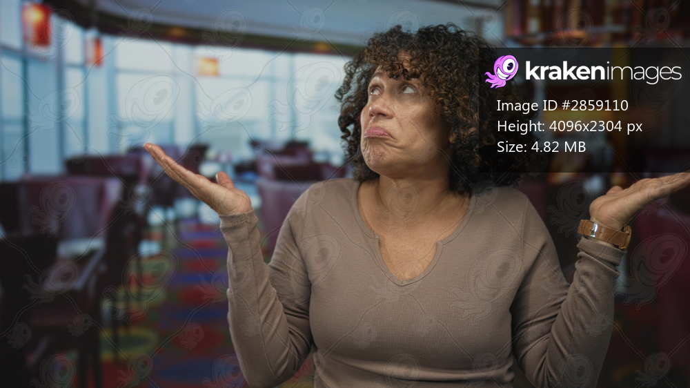 Woman with raised palms shrugging shoulders amid red chairs and circular carpet pattern in restaurant; confusion.