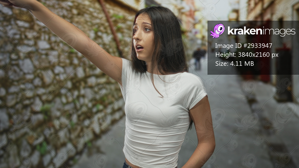 Woman raises arm on city street wearing white tshirt with open mouth expression; seeking help anxiety.