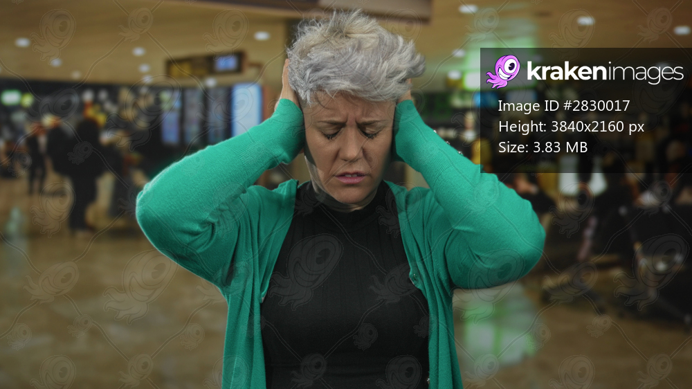 Woman raises arms overhead in airport terminal wearing green cardigan and black top with furrowed brow and open mouth; frustration.
