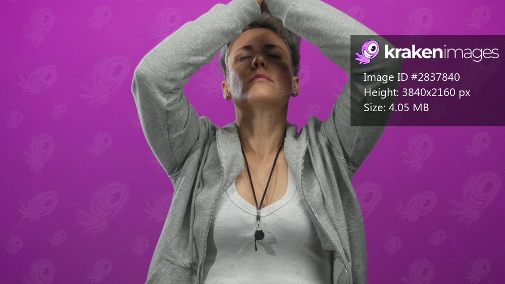 Woman raises arms overhead revealing chest and pendant necklace while wearing white tank top in studio; calm meditation.
