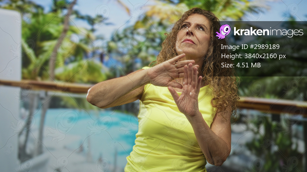 Woman raises arms reaching upward in studio with tropical backdrop and pool mural, wearing yellow sleeveless top; determination focus.