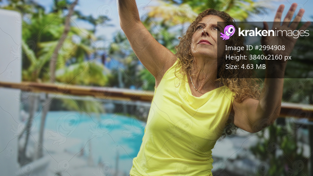 Woman raises arms reaching upward in studio with tropical backdrop and pool mural, wearing yellow sleeveless top; determination focus.