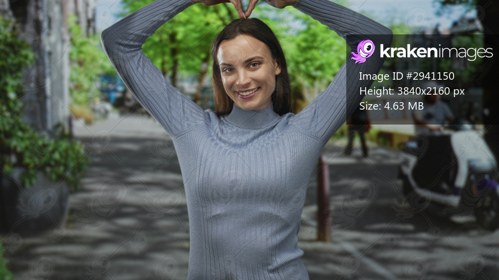 Woman raises arms and shows hands on a sunlit street with trees and canal, smiling with closed eyes in relaxed motion; serenity.