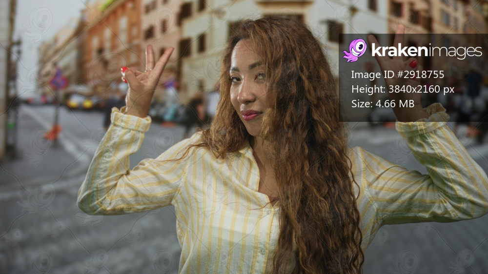 Woman raises both arms on a cobblestone street crosswalk wearing yellow striped shirt and long curly hair in a city square, frontal pose; confidence.