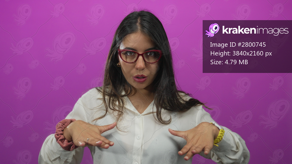 Woman raises both bare hands in front of her body against a pink wall in a professional studio setting; calm breathing.