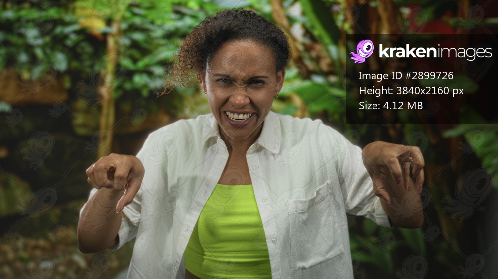 Woman raises both hands with fingers splayed in a forest amid green foliage and white shirt; playful mischief.