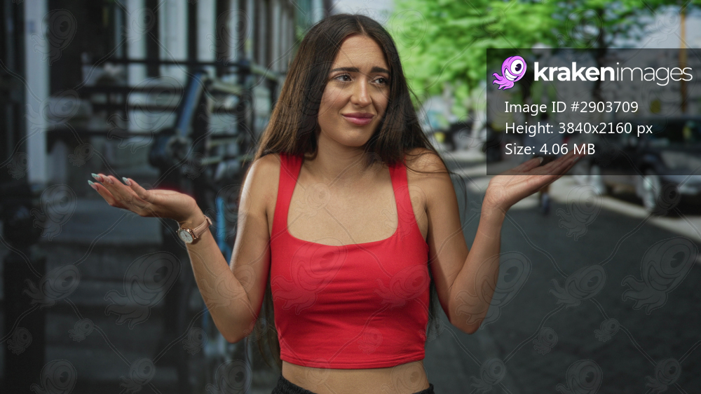 Woman raises both hands in a shrug gesture with palms visible and bare midriff in a red tanktop on a city street; uncertainty.