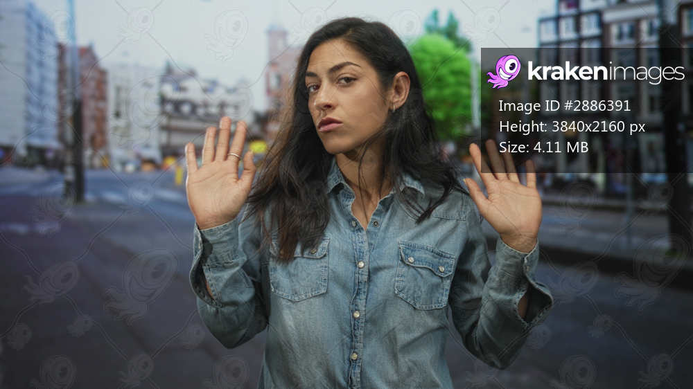 Woman raises both hands with palms visible on a city street in denim shirt, skeptical expression and slightly turned head; defiance.