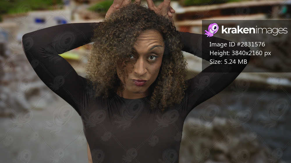 Woman raises both hands to her head making rock horns finger gesture at street edge with sea rocks in view; fun.