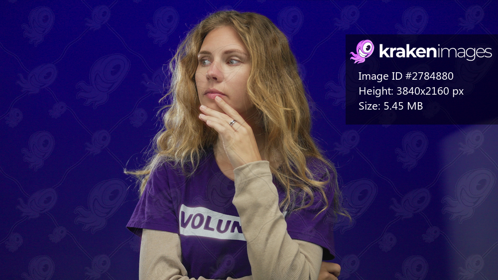 Woman raises chin and looks pensive in a studio setting highlighting a blonde volunteer portrait capturing a thoughtful mood on a purple backdrop with a young presence. - Kraken Images