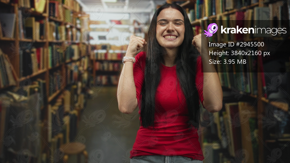 Woman raises clenched fists and smiles in a crowded library aisle between tall bookshelves, showing forearms and bracelet in victory pose; study success triumph. - Kraken Images