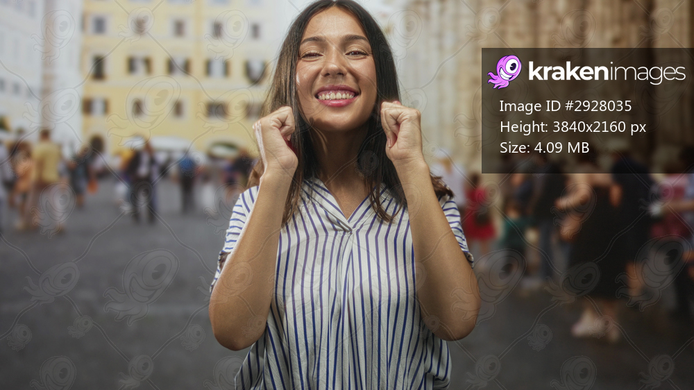Woman raises clenched fists to face and smiles brightly amid a bustling old town street scene; joy travel memory.