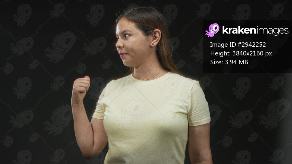 Woman raises fist in studio against black backdrop wearing pale yellow t shirt and gold necklace; determination perseverance resilience grit.