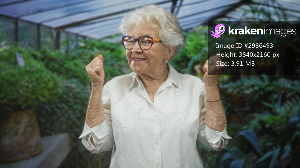 Woman raises fists in greenhouse building among lush plants, smiling and looking triumphant; joy resilience.