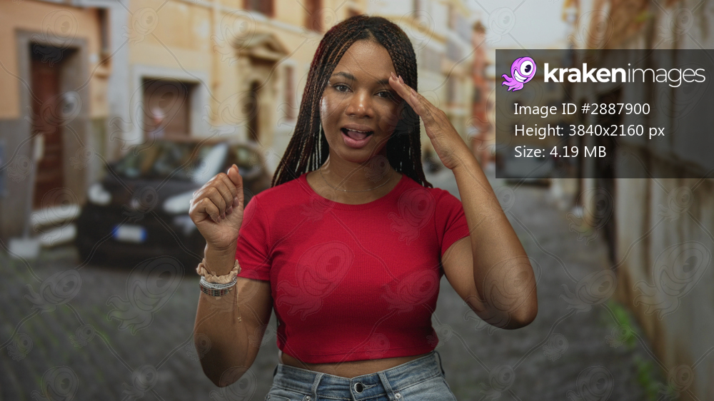 Woman raises fists and smiles on old town street with cobblestone and parked car, wearing red cropped shirt and jeans; celebration.