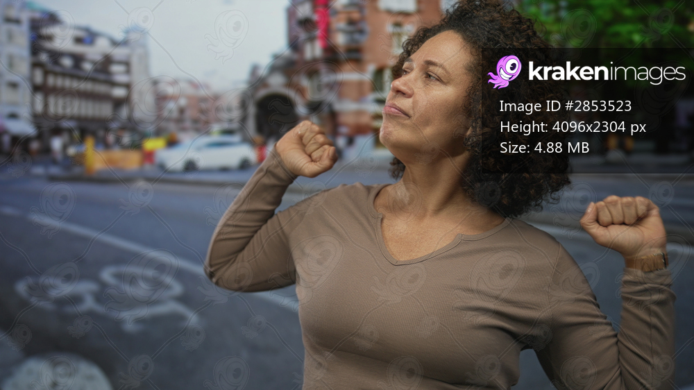 Woman raises fists and stretches arms on a busy street in the city, looking upward toward buildings; confidence resilience.