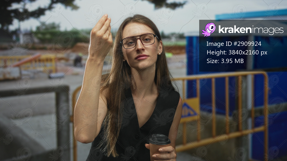 Woman raises hand with fingers together while holding a coffee cup at building site beside orange safety barrier and portable cabin; confidence defiance. - Kraken Images