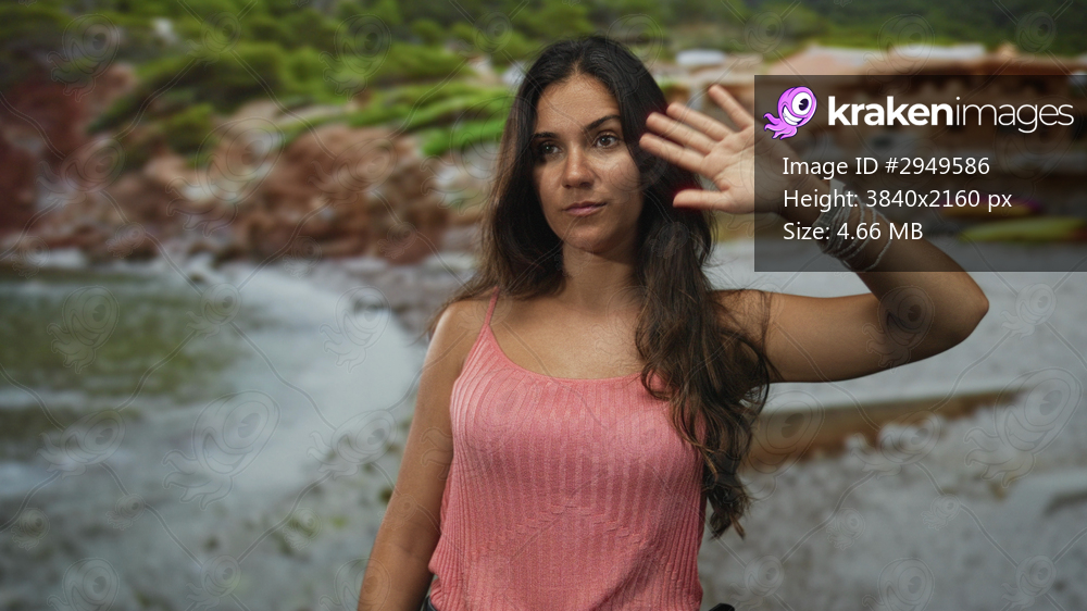 Woman raises hand in front of face on beach showing palm and bare shoulder in pink tank top; calm reflection.