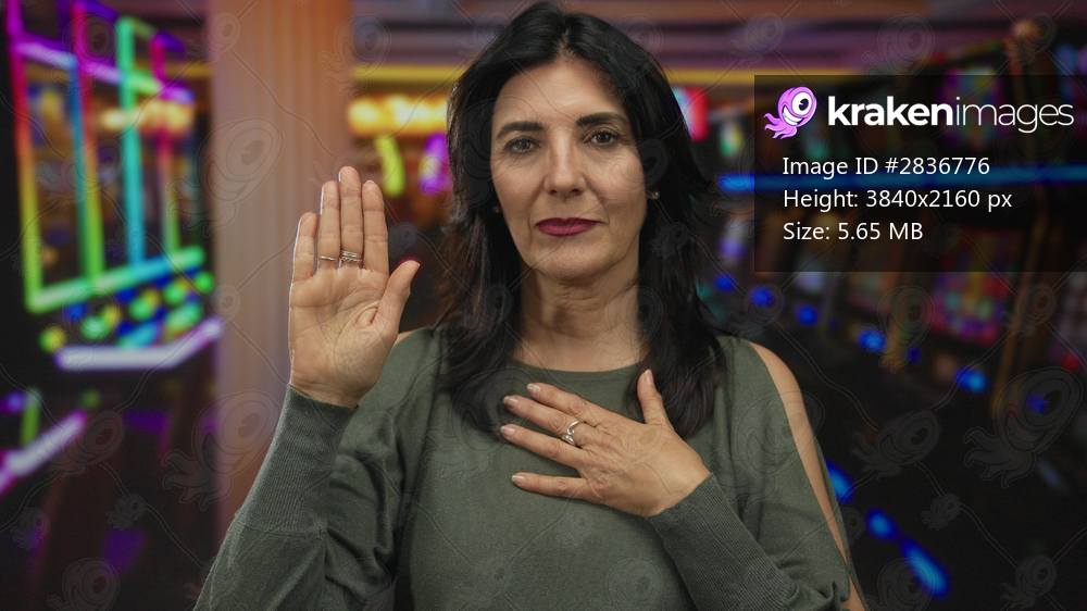 Woman raises hand palm and places other hand on chest beside slot machine row in casino; pledge sincerity.