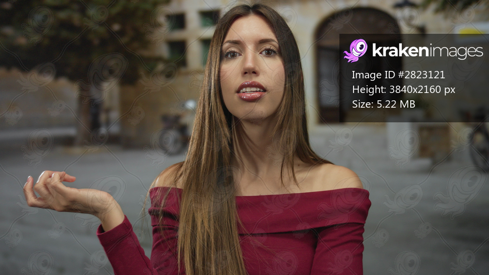 Woman raises hand palm up and parts lips while speaking expressively on street in daylight; confusion frustration bewilderment exasperation.