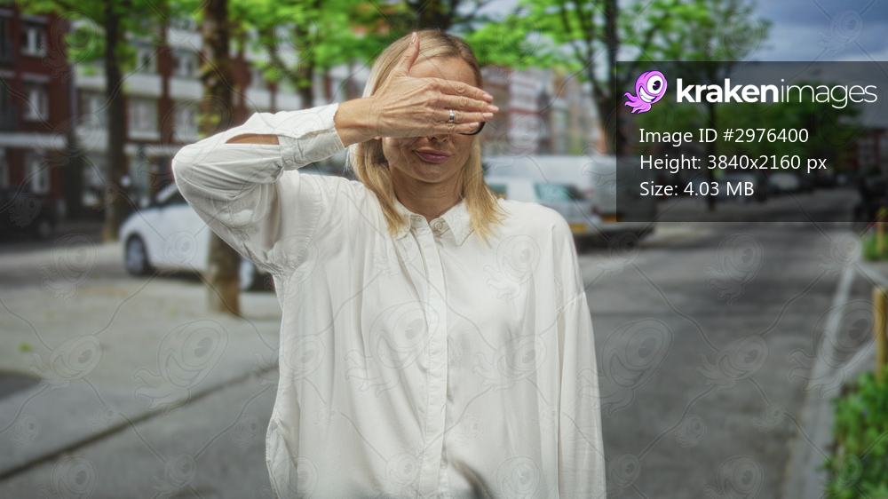 Woman raises hand to forehead while wearing glasses and white shirt on a residential street; weariness solitude.