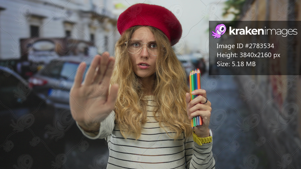 Woman raises hand to stop traffic on a street, showing a blonde young artist in a red beret and glasses holding pencils with colored tips.
