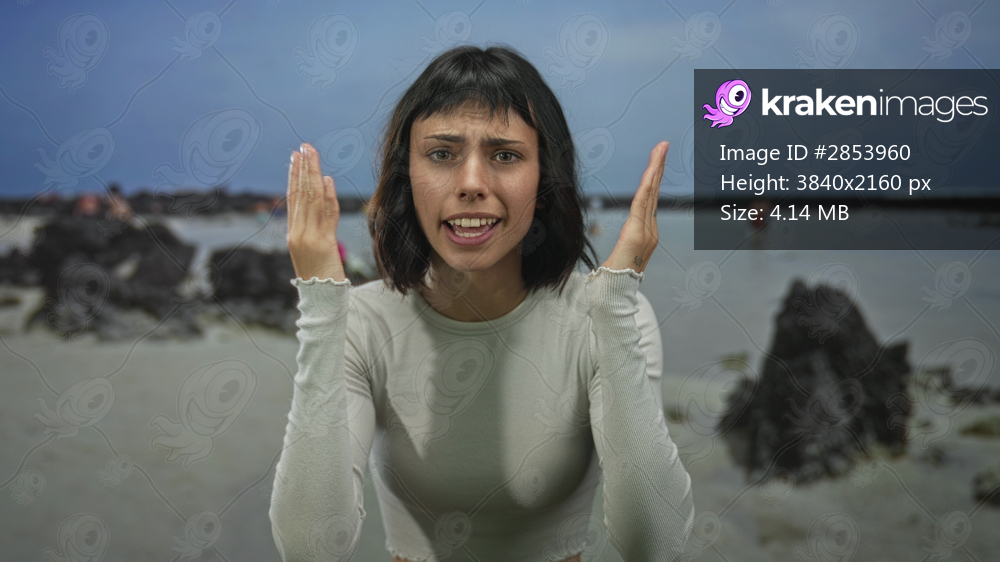 Woman raises hands at beach shore while she gestures with open palms in front of rocky sand landscape and shallow water; confusion.