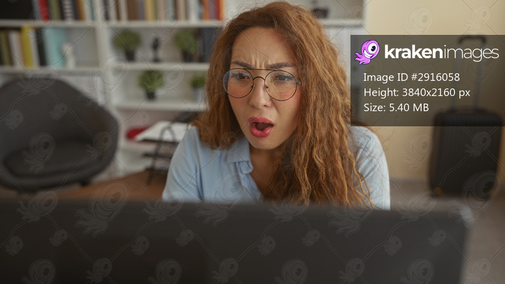 Woman raises hands at desk in office building, frowning and gesturing at computer monitor while wearing glasses; work stress frustration.