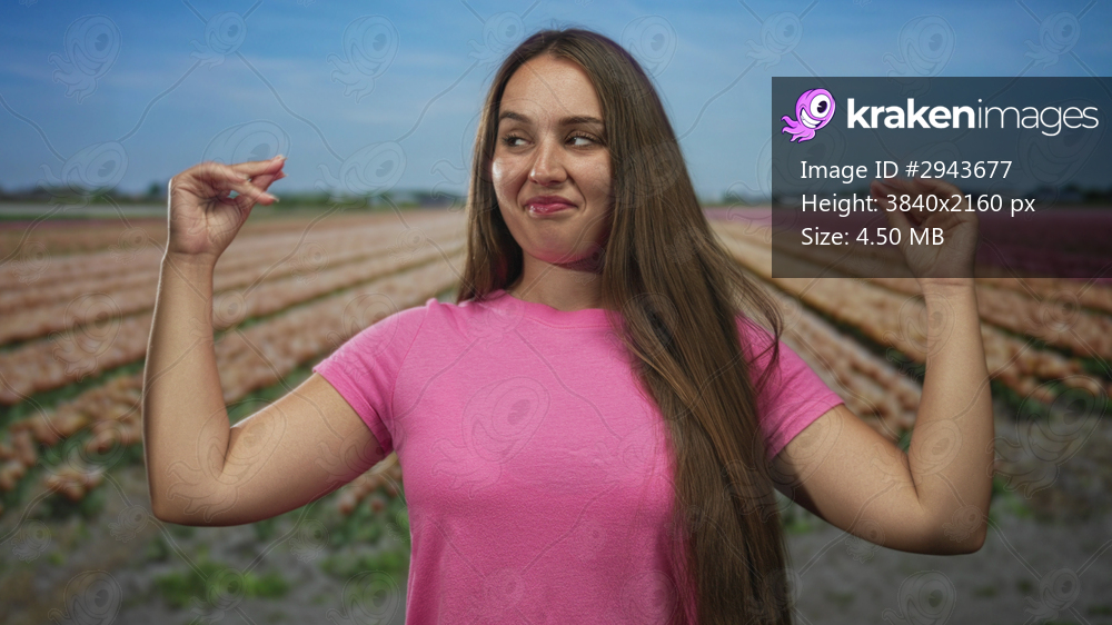 Woman raises hands beside pink flower rows in field wearing pink t shirt looking sideways with long hair; carefree joy.