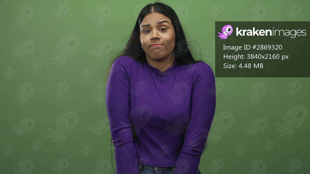 Woman raises hands in green studio wearing purple sweater and shoulder shrug with puzzled expression; uncertainty.