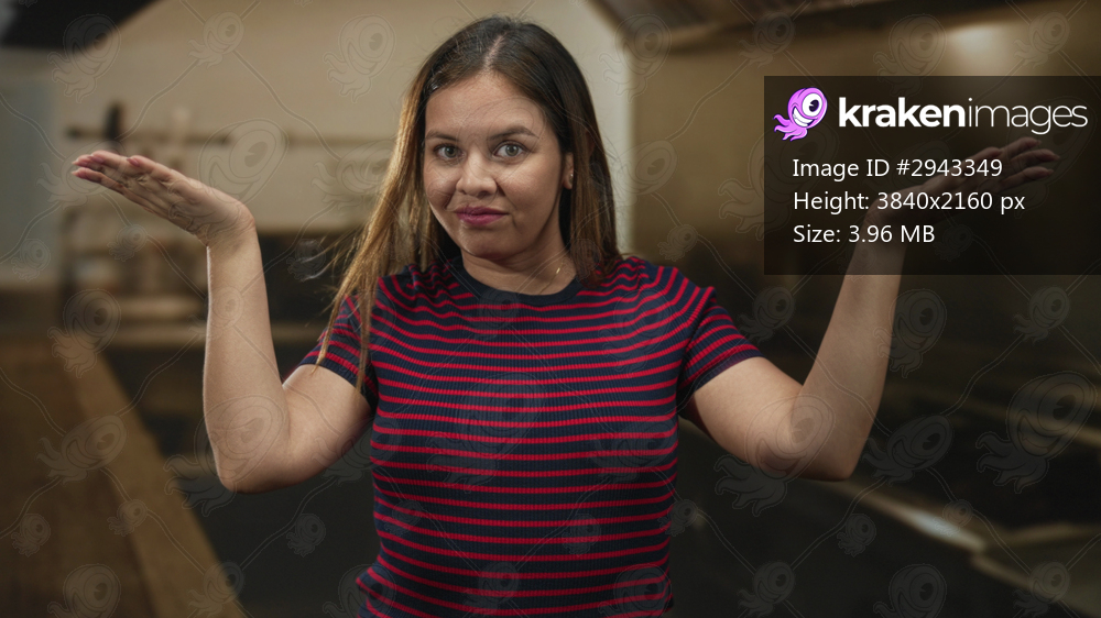 Woman raises hands in shrug gesture in a kitchen setting wearing red and navy striped shirt, palms visible and shoulders slightly lifted; confusion.