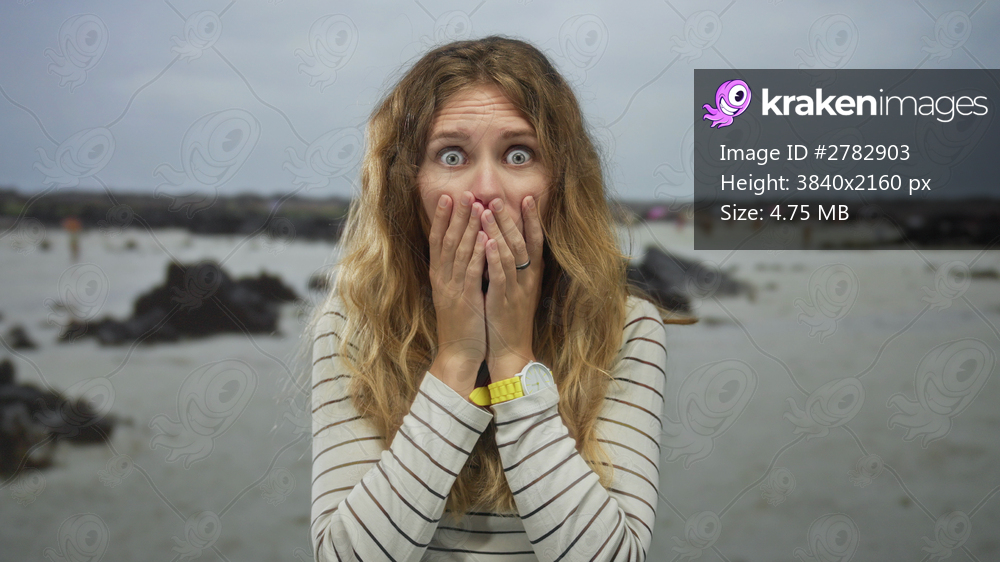 Woman raises hands in surprise on beach showcasing her blonde young hair as she covers her mouth with wide eyes clad in striped shirt.