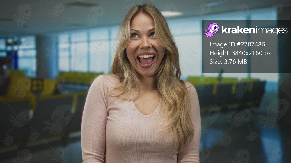 Woman raises hands near face in airport terminal smiling broadly; excitement anticipation joy wanderlust.