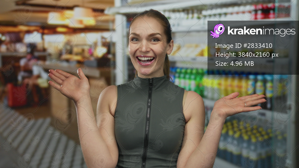 Woman raises hands near face in bright restaurant aisle lined with chilled drinks on shelves and warm lamps overhead; joy.