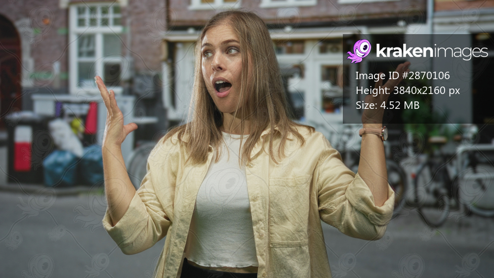 Woman raises hands with open palms and open mouth expression on busy city street in front of building; astonishment.