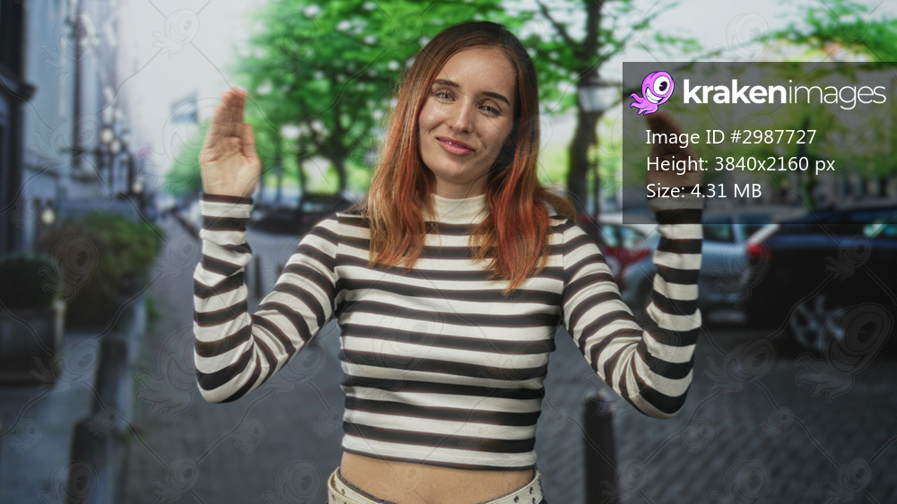 Woman raises hands palms facing forward on a street, wearing a striped turtleneck showing midriff and smiling; playful confidence.