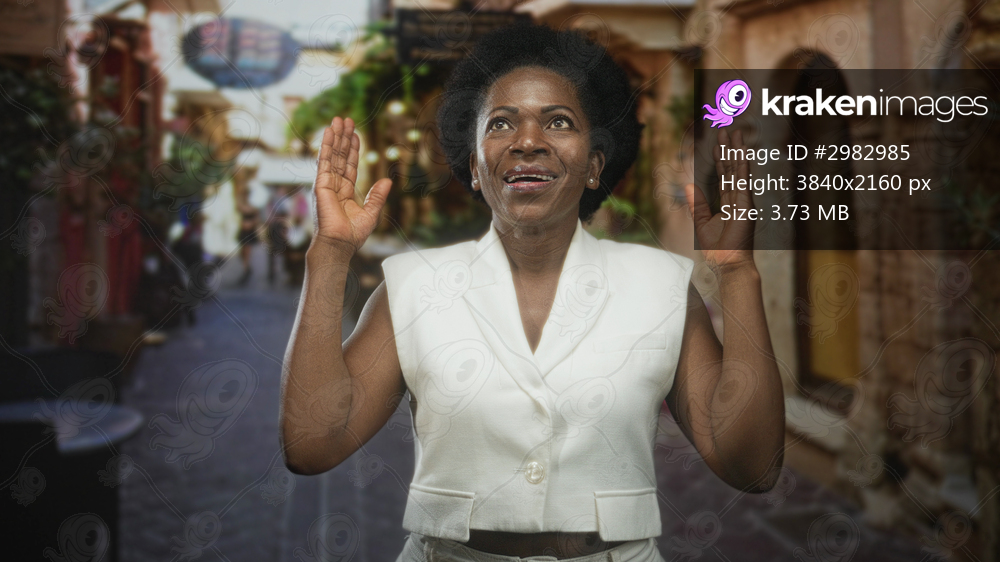 Woman raises hands palms facing forward wearing white vest on cobblestone street with archway shops and warm sunlight; joy gratitude.