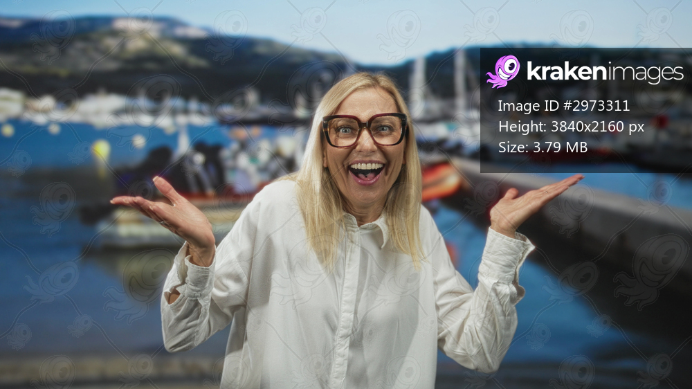 Woman raises hands palms up in a shrug gesture in studio with marina dock backdrop and boats in view; carefree joy.