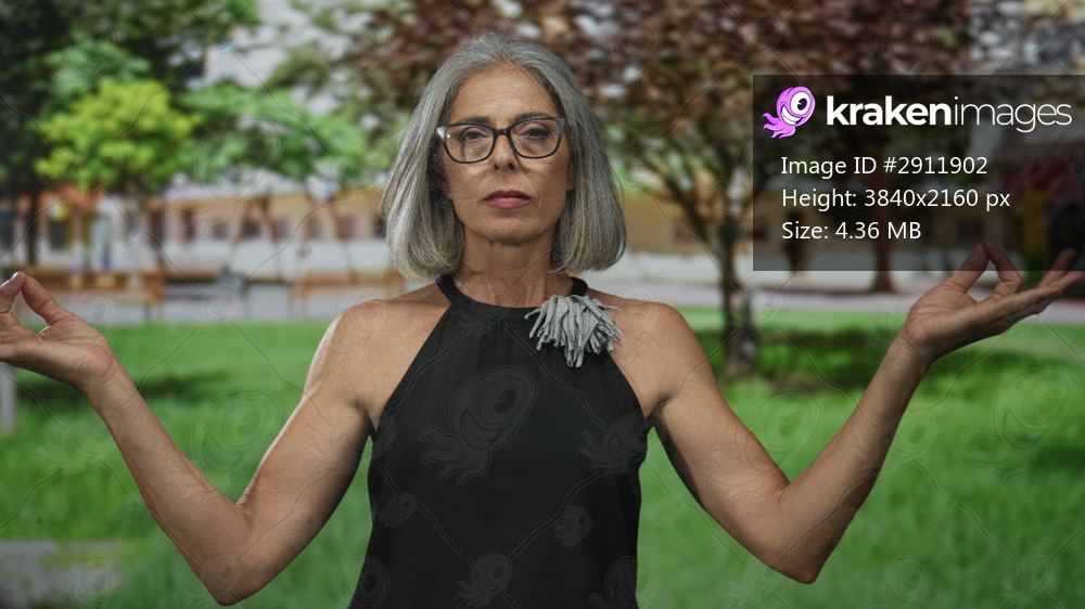 Woman raises hands palms up in park wearing black sleeveless top and glasses, grey hair showing; serenity reflection.