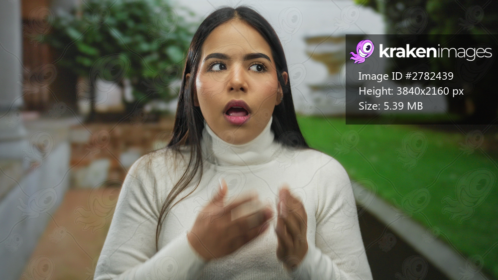 Woman raises hands to mouth in a surprised expression outdoors with young latin hispanic features beside garden and longhair framing face under white turtleneck. - Kraken Images
