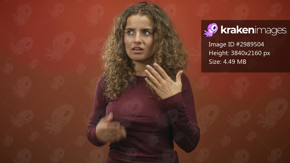 Woman raises hands toward face in studio, curly hair, maroon top, palms visible and puzzled expression; confusion uncertainty.