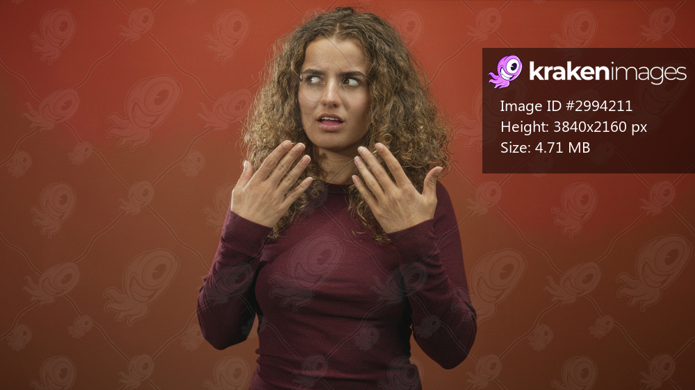 Woman raises hands toward face in studio, curly hair, maroon top, palms visible and puzzled expression; confusion uncertainty.